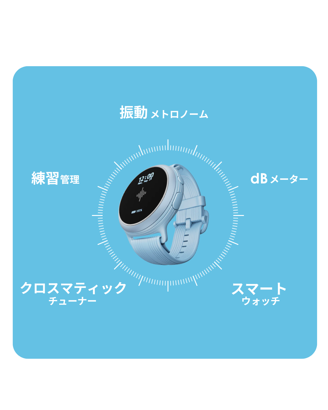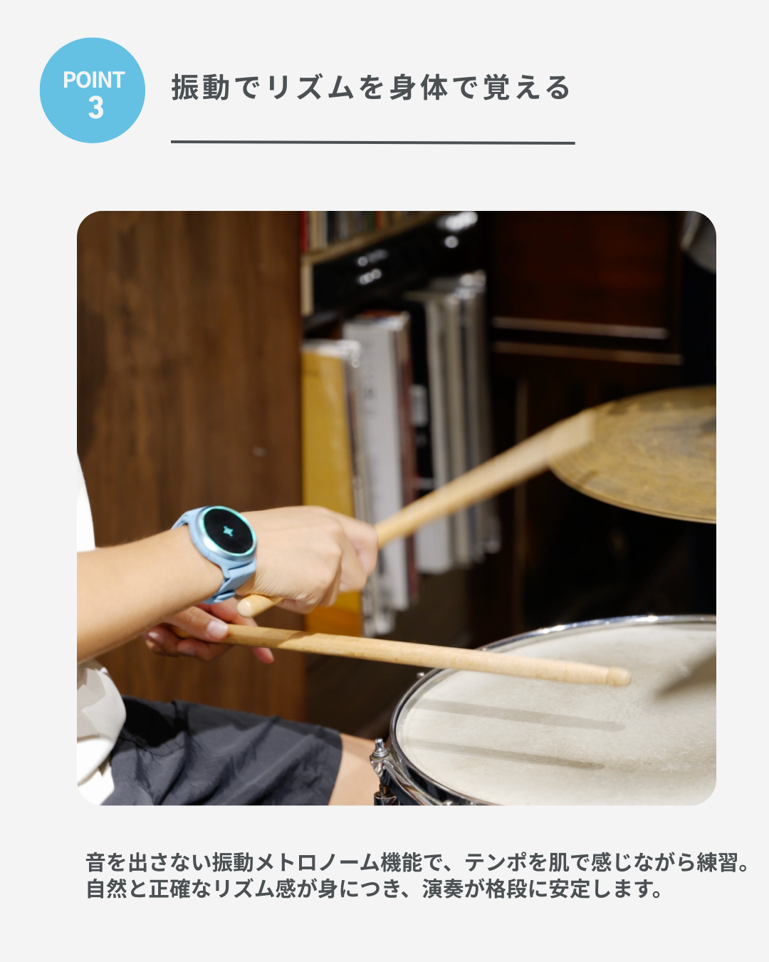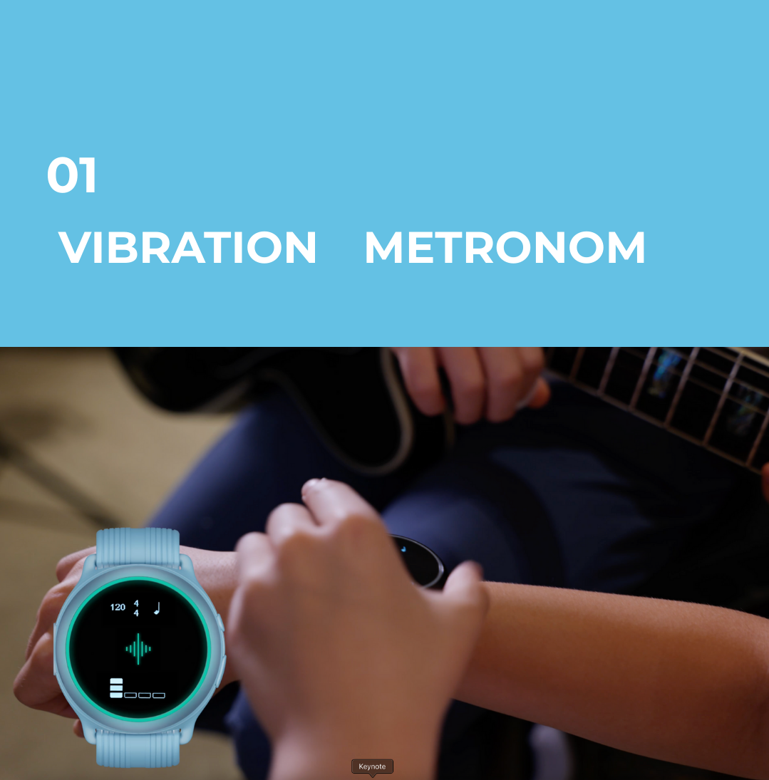 A. 推奨装着部位は 手首・腕・足首・太もも・胸・肩 です。演奏スタイルにより、ドラマーは胸/太もも、ピアノでは手首や足首、ギターは手首や上腕が好まれる傾向があります。(胸や肩、太ももなどへの装着にはオプションのボディバンドが必要となります)